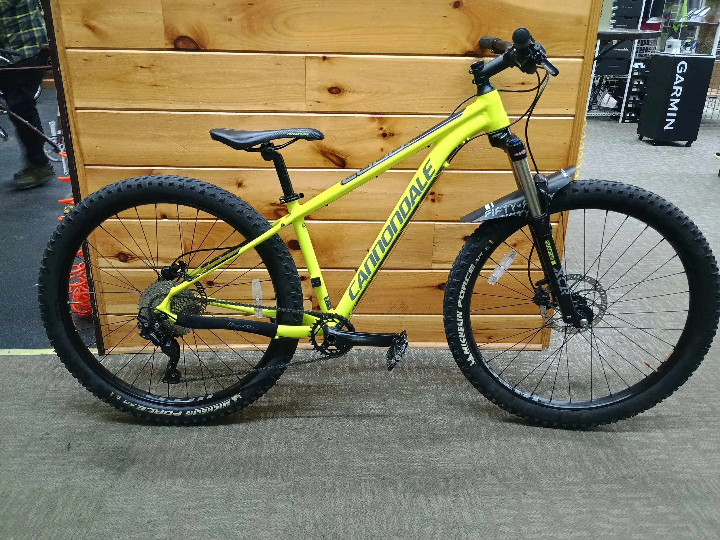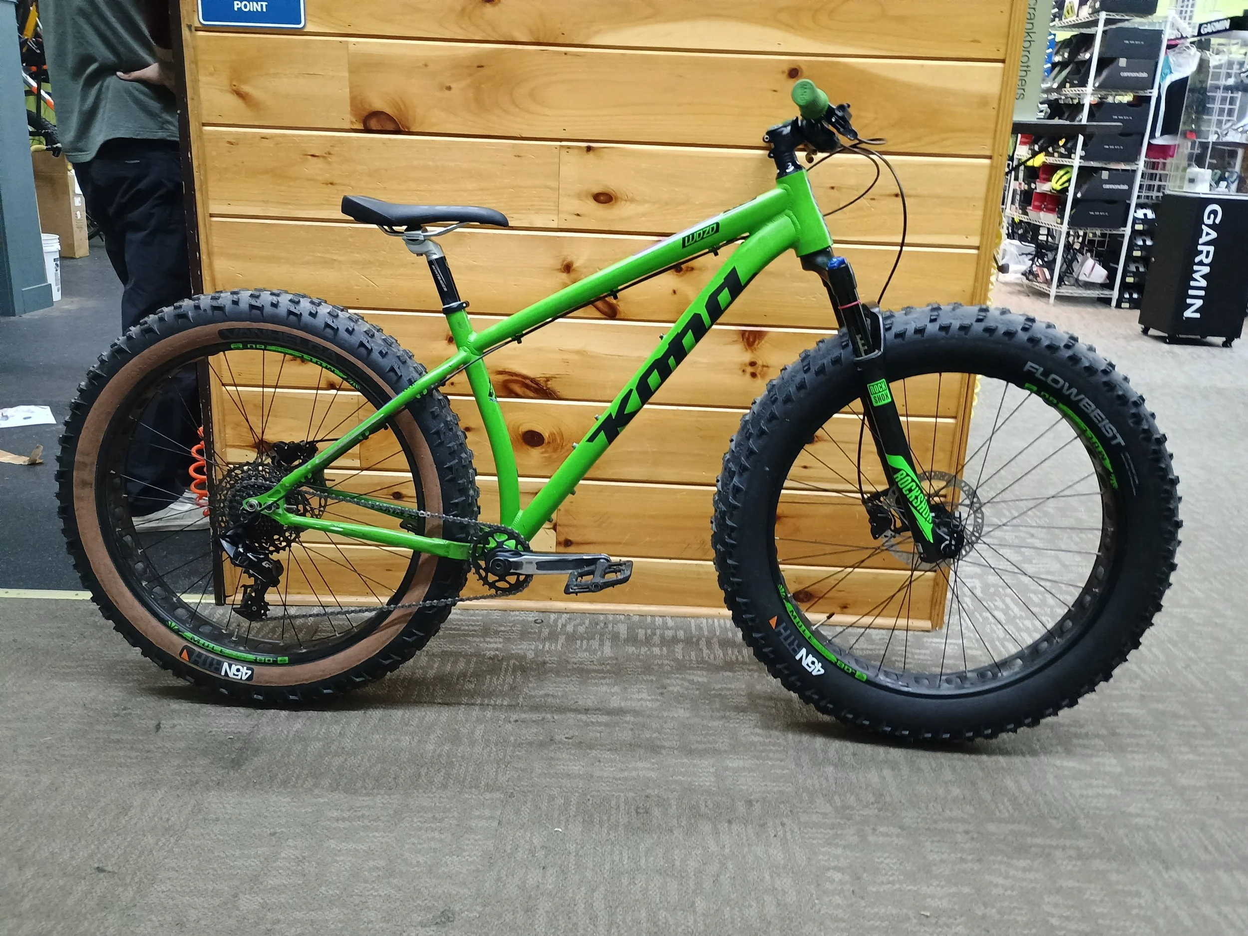 27.5” while with 2.8” wide tires, set up tubeless for traction and flat prevention